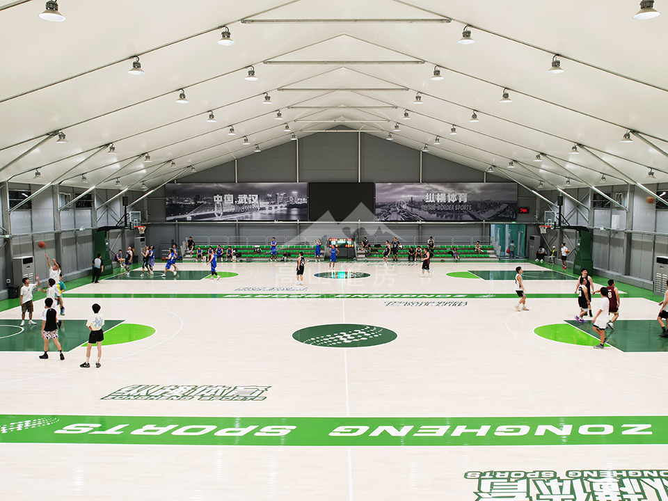 篷房内部采用无柱大跨度设计,最大跨度可达60米,提供开阔、完整的运动视野,空间利用率高。这种结构使其能够灵活适配篮球、羽毛球、网球、冰球等多种运动项目,并可以快速转换场地功能,轻松兼顾小型音乐会、展览等商业或社区活动,实现“一篷多能”。