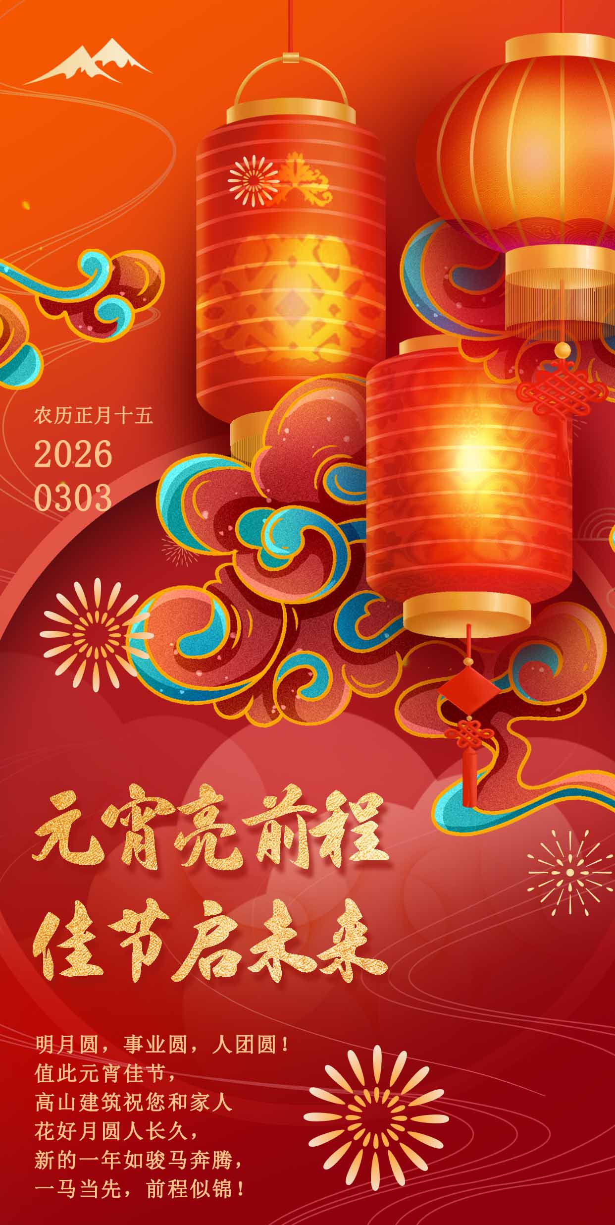 灯火璀璨映佳节,元宵安康启新篇。当一轮圆月悬于夜空,当一盏盏花灯点亮街巷,我们迎来了正月十五元宵节——这个承载着团圆期许、寄托着美好愿景的传统佳节。值此良辰,高山篷房向每一位并肩同行的伙伴、每一位支持信赖我们的客户,致以最诚挚的元宵祝福,愿大家岁岁皆圆满,事事皆顺意。